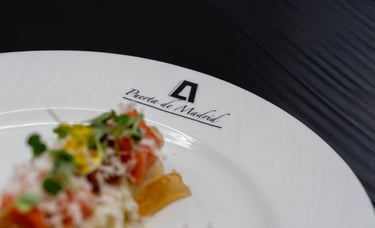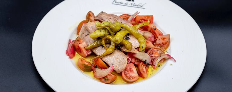 TOMATE DE TEMPORADA CON VENTRESCA, PIPARRA Y CEBOLLETA ENCURTIDA.