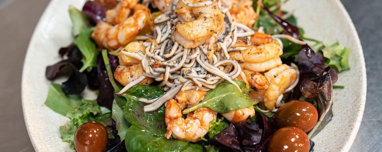 BROTES, GAMBA ROJA, NARANJA, GULA, CHERRY Y VINAGRETA DE TOMATE.