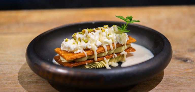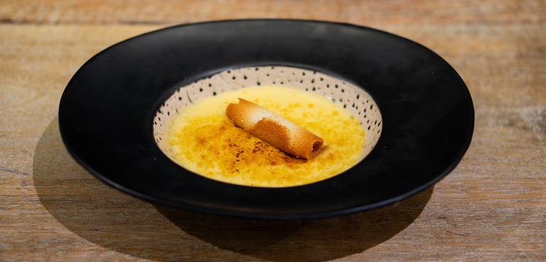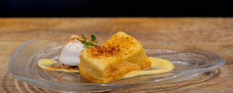 TORRIJA CARAMELIADA CON HELADO DE MERENGADA Y CREMA INGLESA.